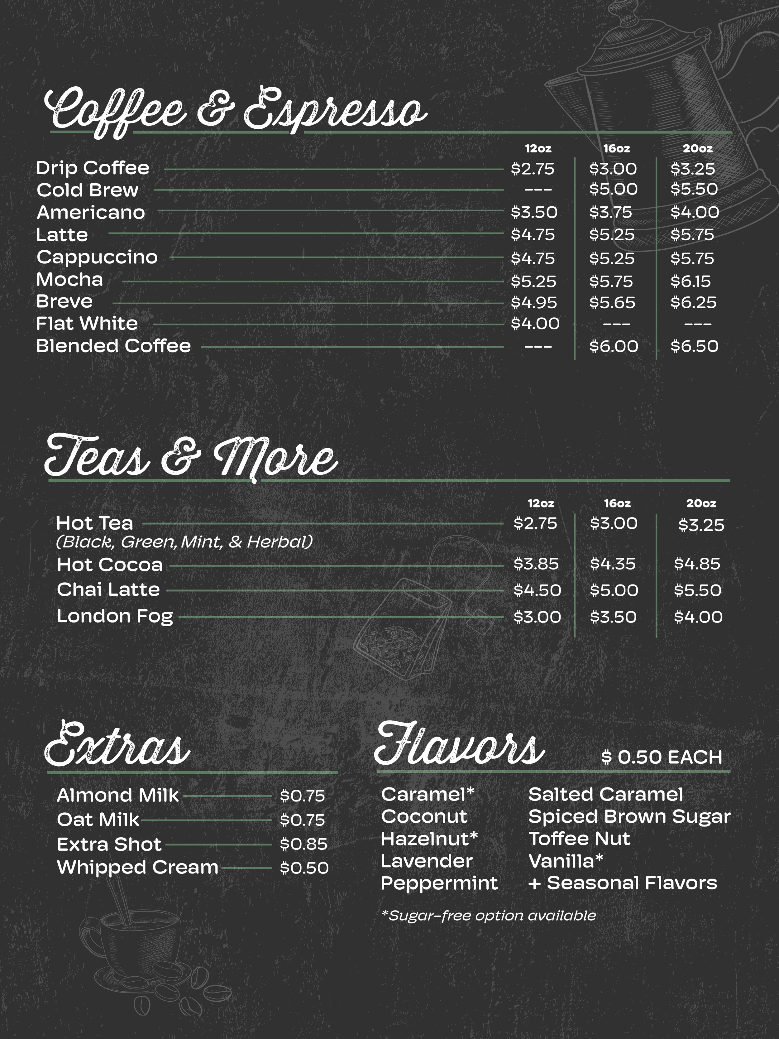 Handcrafted espresso drinks, lattes, smoothies, cold brew, and signature roasts, and more! Available at our weekday stops or served at your event by our trailer or
